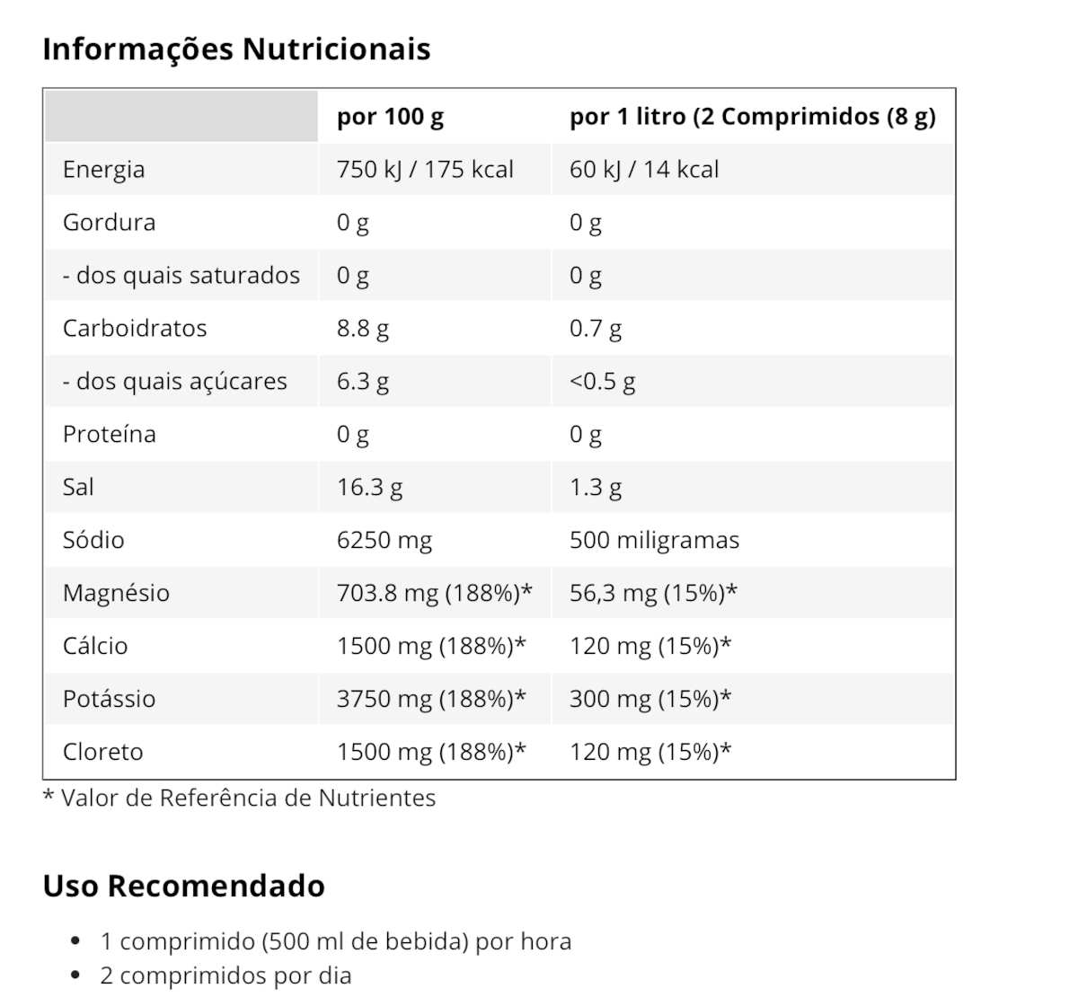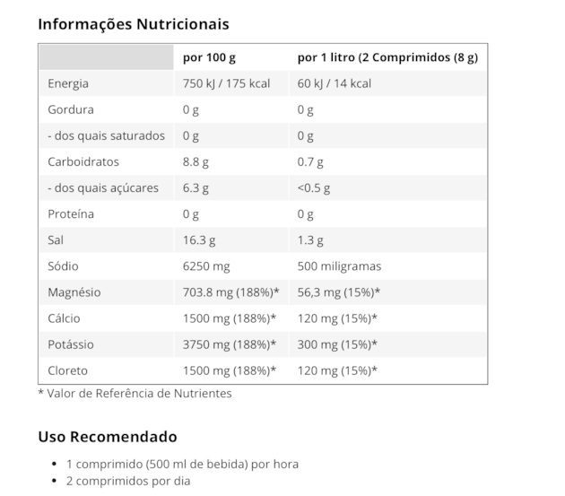 | por 100g | por 1 litro (2 comprimidos (8g) | |