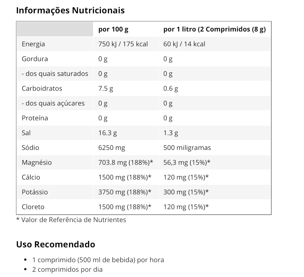 | por 100g | por 1 litro (2 comprimidos (8g) | |