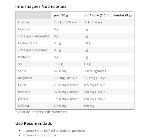 | por 100 g | por 1 litro (2 comprimidos (8 g) | |