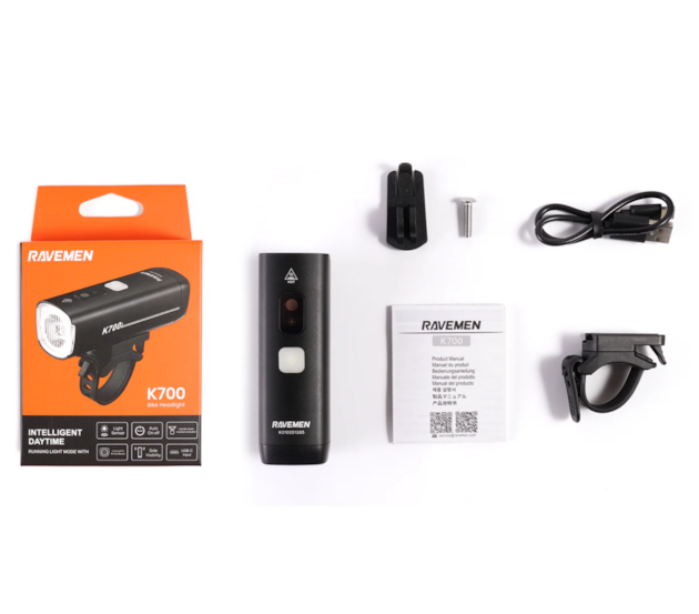 O pacote inclui: k700 * 1, suporte invertido * 1, cabo de carregamento USB-C * 1, manual/cartão de garantia * 1, suporte de tira de borracha * 1 (para guiadores redondos de 22,2 mm a 35 mm de diâmetro e alguns guiadores Aero)