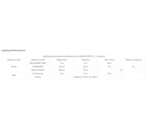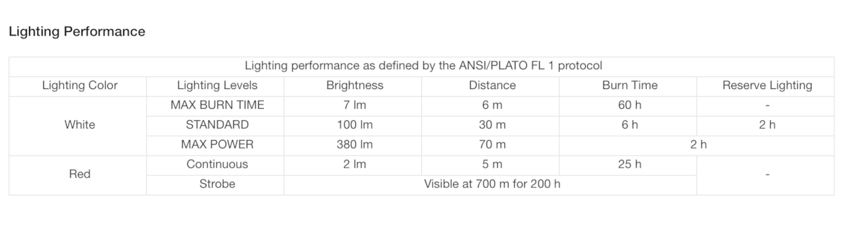 | Lighting Color | Lighting Levels | Brightness | Distance | Burn Time | Reserve Lighting |