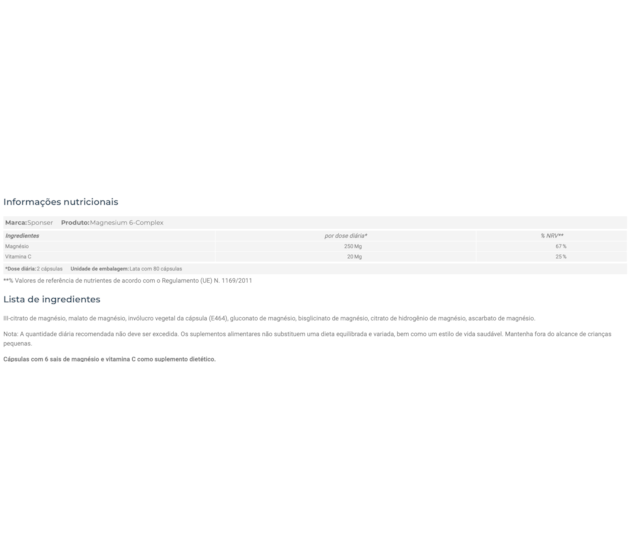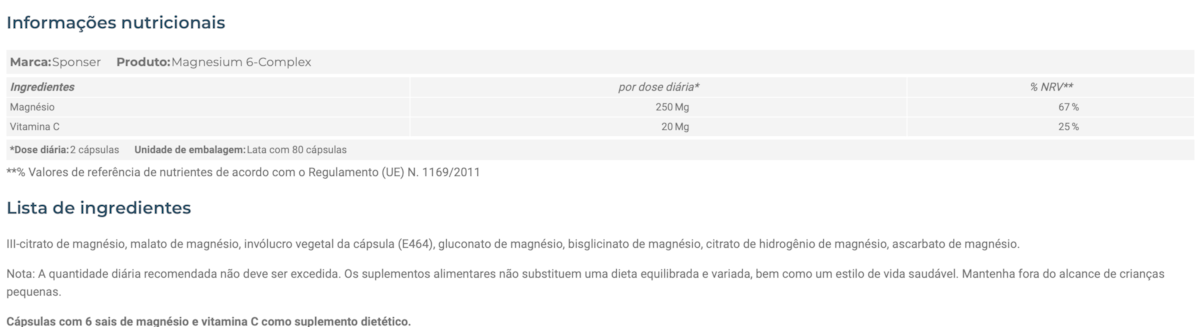 - Complexo SPONSER Magnésio 6 (lata de 81 g / 80 cápsulas)
