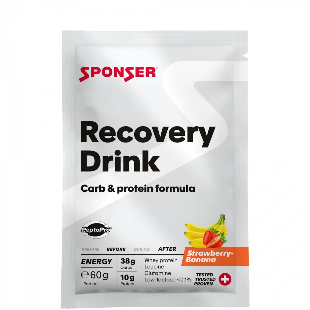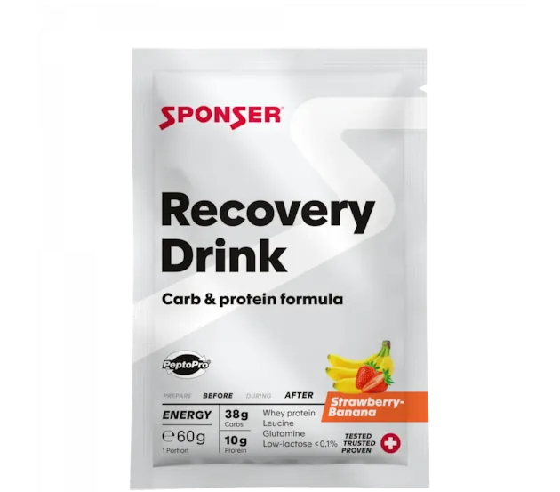 Sponser Recovery Drink Morango-Banana 60g. Sponser Recovery Drink 1200g é tudo o que precisas para recuperar após o exercício físico. - Formulado a partir de caseína e hidrolisado de proteína de soro de leite - Isolado de proteína de soro de leite obtida através de microfiltração de fluxo cruzado fornece proteína concentrada, natural com fatores de alta qualidade (25% de BCAA's). - Enriquecido com aminoácidos livres leucina (1,85g/100g) e glutamina (1,6g/100g). - Enriquecido com as fibras dietéticas solúveis (inulina) Vantagens de consumir Sponser Recovery Drink 1200g - Amplo espectro de efeitos: energia, construção e preservação - Preparação com água - Completa reposição de vitaminas - Sem edulcorantes artificiais